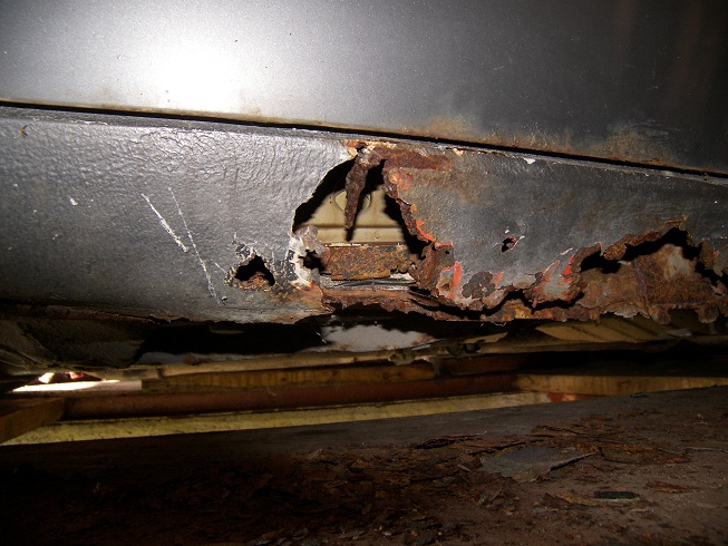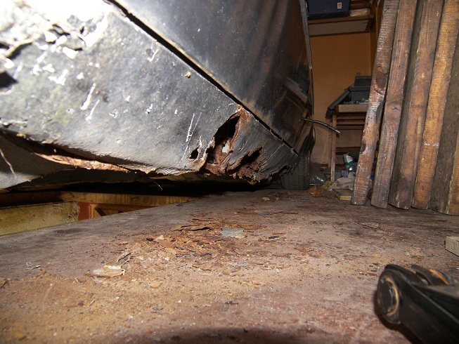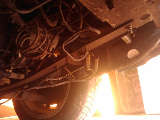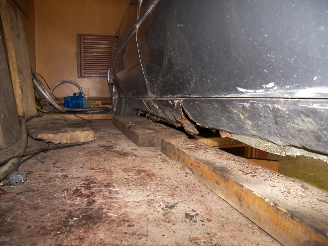 Nusirankiojau hidraulikos vamzdelius kelis, atėjo laikas nusiimti pusašius, bet čia išlindo bėda - vairuotojo pusėj nėra kur statyti domkrato. Tiek per vidurį, tiek prie priek. rato lenda į vidų (žr. būklės foto žemiau). Pasiskolinsiu hidraulinį ir kelsiu landžeroną, kitaip nieko nebus. Reikės ieškoti rimto dėdės pervirinti slenksčiams ir palopyti dugnui.